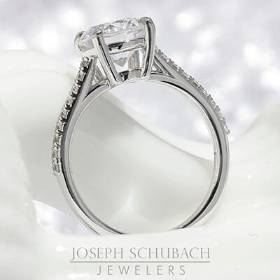 The Lucia cathedral engagement ring with a lab grown diamond band, approx .18ct t.w., custom made for any center stone size and shape, any metal, single our double prongs, or with anything else you have in mind. Shown with single claw prongs and a 2ct round center stone, and priced for up to a 2ct round center stone. Contains lab grown diamonds. Mined/natural diamonds or other gemstones also available, contact us for information.